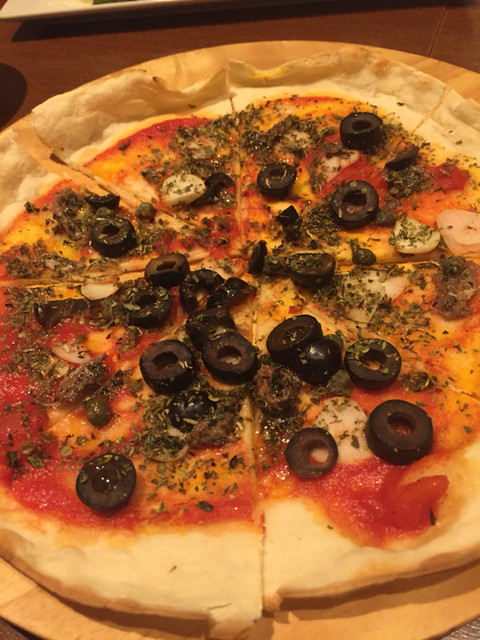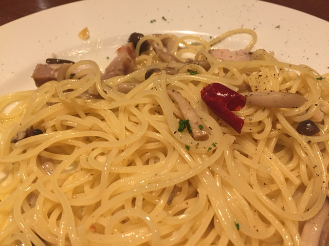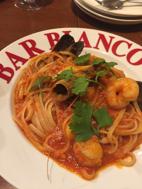 赤ワインボトル注文。ワインが進みま〜す。パスタとピザ追加注文。大好きなペスカトーレにペペロンチーノ、リゾットも注文。リゾットのご飯の硬さが良い〜わ。パスタもアルデンテでウマウマ☆*:.。. o(≧▽≦)o .。.:*☆追加で赤ワインをカラフェ注文。