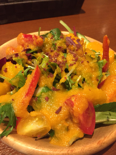 ビアンコサラダのドレッシングがめちゃウマい❣️人参をすりおろした手作りドレッシングですわ。人参の甘味とお酢の優しい味がマッチしていて気に入りました。