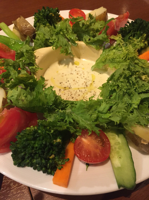 姪が最後にバーニャカウダを注文。彼女は娘さんに野菜フェチって言われるくらい野菜好きで必ずバーニャカウダを食べています。新鮮な変わったお野菜満載で超美味〜〜。ほんのり黄色い歯ごたえのよいスティック状の野菜が何だろうってことになってお店の人に聞きましたところ、何と黄色い人参だそうでビックリ‼️ だから甘いんだ〜って一同納得しました。