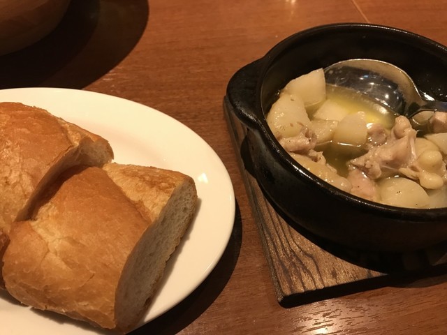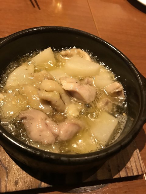 おすすめメニューのチキンと大根の煮物じゃなくてアヒージョを発見! 変わっているやんって注文。チキンの旨味がオリーブオイルにいい具合に入っていて美味しいです。それでいてしつこく無くてさっぱりしていい感じの一品でした。家でもこの組み合わせのアヒージョが出来そうだと料理好きの姪が燃えてました。