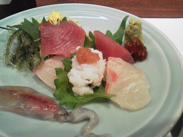 まぐろの下にあった烏賊の刺身に巻かれた雲丹。いいお色してました。左奥に海ぶどう見えます。