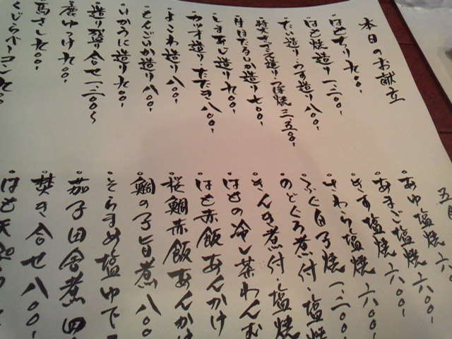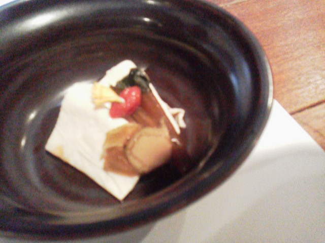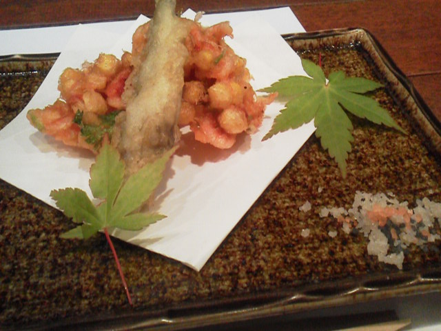 「莫大海(ばくだいかい)です、木の実を戻したものでして、刺身につけますと、お醤油の絡みが良くなるのです。つるつるした素材例えば、烏賊な どにお付け下さい」との丁寧な説明。しかも、海ぶどうまでついています。ヽ(*`゚∀゚´)ノォォォォォォ!感激、何と、下の方にこっそり 置かれている烏賊には雲丹が巻いてあったのです。嬉しくて感涙しそうに(ノ◇≦。) なりました。