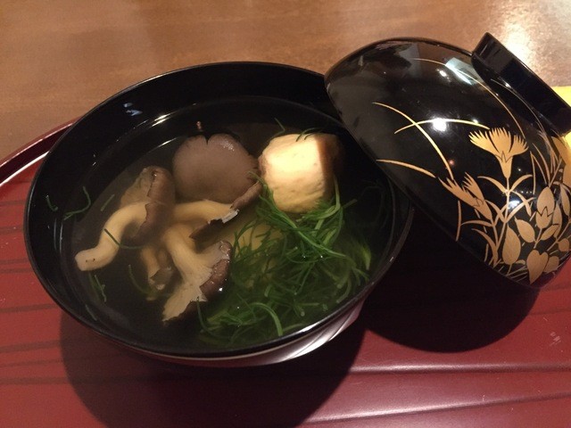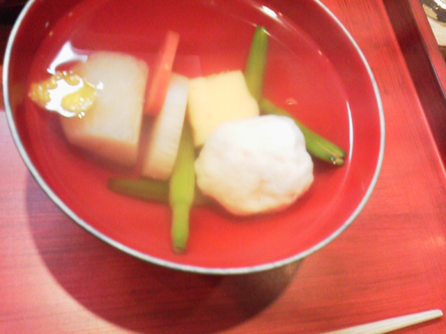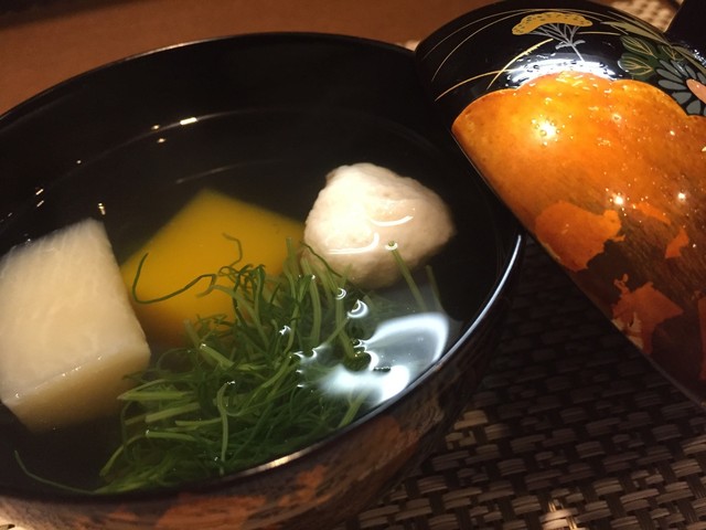 お吸い物:蓮根団子 甘鯛しんじょ 堀川牛蒡旨煮 鼈甲大根 菜の花 日の出人参 柚子