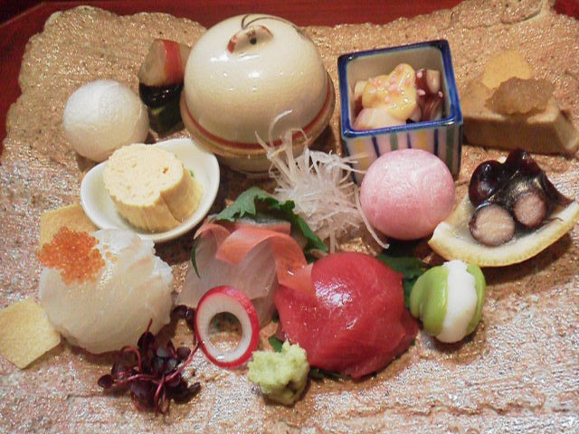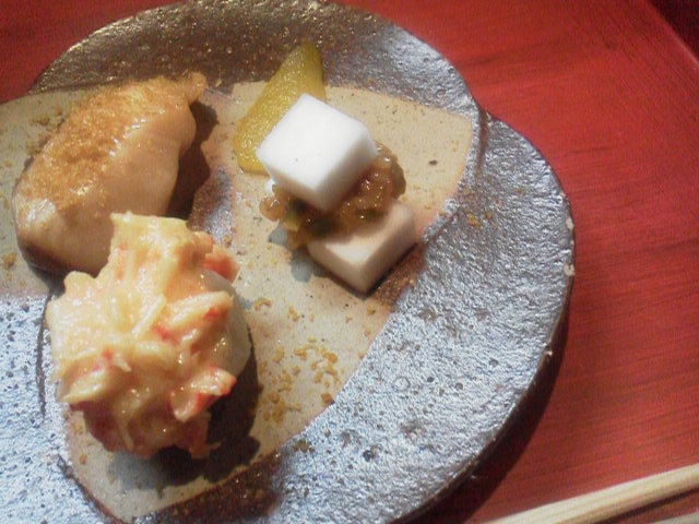 刺身八寸:赤餅花(カラスミ)白餅花(鰹和えチーズ) 中トロと鯛刺身 雲丹手毬寿司 生麩赤味噌味 生麩のいくらかけ 黒豆串 鳥のつくね 鴨肉 蓮根チップ 白葱赤味噌田楽 鰻巻き