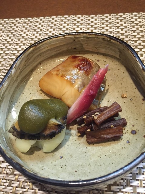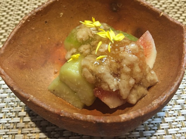 ご馳走の言葉通り、馳走してもてなしてくださるお料理に感服です。今日また生まれて初めて食すものが何品かありました。四角豆、イチジクに鶏そぼろの絶妙な甘辛がマッチしている煮、鮑に肝ソースがマッシュポテトに乗っていて肝の色なんだけど綺麗なカーキ色に目を見張ったり、炊き合わせの秋刀魚が味醂味の干物だったりなどなど、とても楽しい出会いでした。