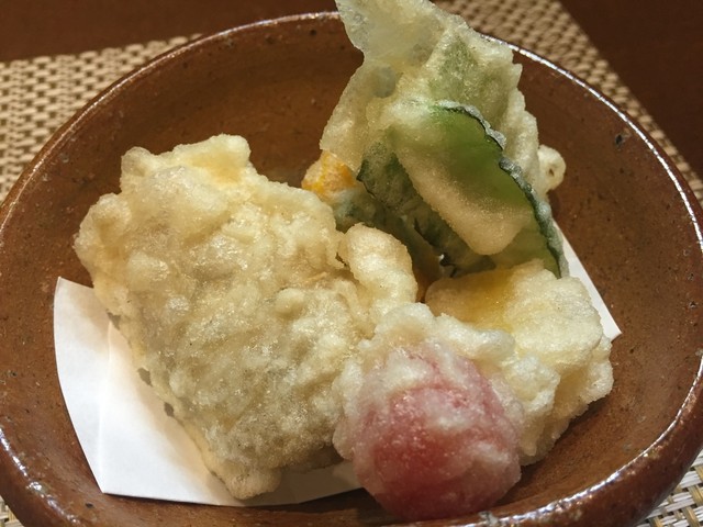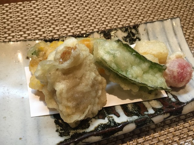 鱧赤玉葱巻天ぷら、小鮎、とうもろこし豆腐天ぷら、モロッコいんげん