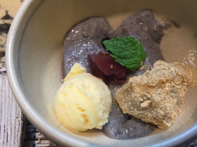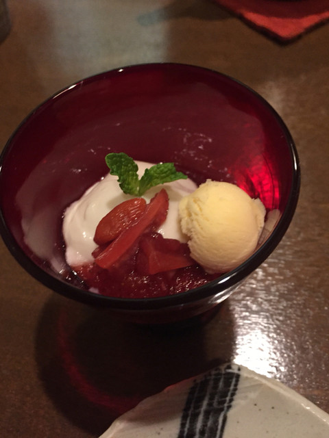 デザート: 胡麻とミルクのババロア 苺のコンポート自家製バニラアイス