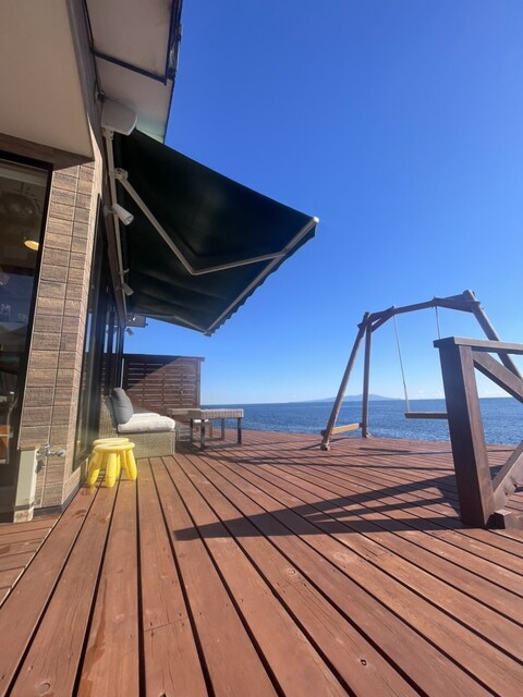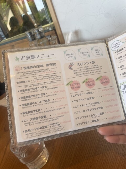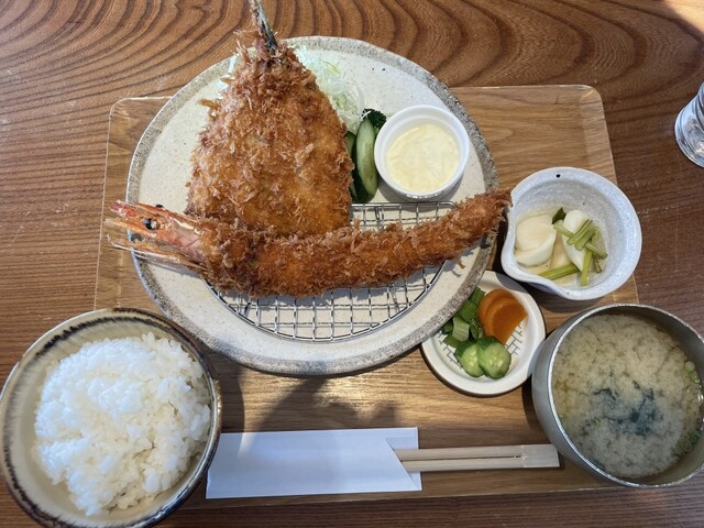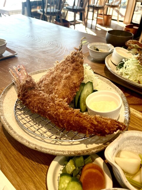 夏にかき氷を食べに来たことがありました、冬は定食もやってるとの事で、寄ってみる事に、予約も出来るようですが、してなかったですが、日曜日オープンと同時に聞いてみると、入れりとの事、席数が少ないので、ランチ希望の人は予約がおすすめ、定食はカキフライと海老フライ、鯵フライなど、フライメインの定食、エビと、鯵を、チョイス、この定食、来てびっくり海老デカイお頭付き、鯵もふわふわの肉厚です、そして隣の人が食べていた牡蠣フライ、殻の上に乗っていてデカイ、美味そう!でした、海老は頭からバリバリ食べられる、尻尾まで美味し、タルタルソースも付いている、そして何より、かき氷屋さんたけに冬でもかき氷が頼める、食後のデザートとしてシェアして食べる事も出来ちゃうし、景色抜群❗️