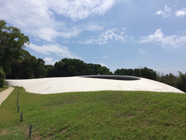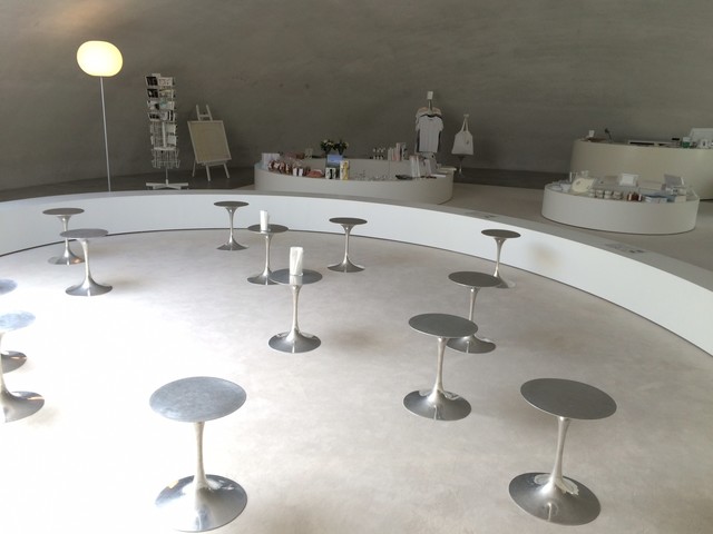 設計は金沢21世紀美術館や十和田市現代美術館を手がけた西沢立衛さん。柱の無い美しい曲線のまるで宇宙船のようなコンクリートの建物。一滴の水が落ちた瞬間の形をイメージしているのだそう。