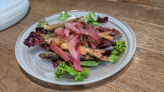 稚鮎のフリットと持田さんの葉たまねぎでカルピオーネ