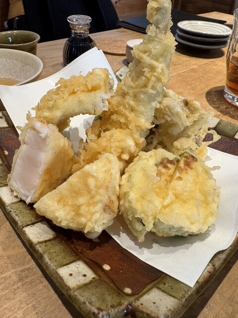 そして天ぷら盛り合わせ。じゃんけんしながら食べ進めます。ホタテがいつも美味しいんだよなぁ。
