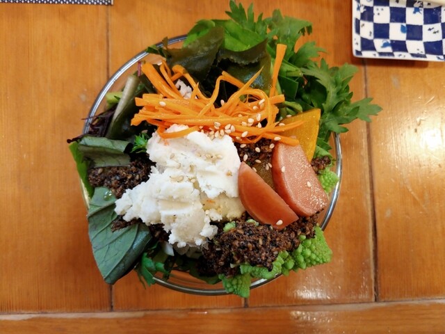 チャーシュー、人参、胡瓜、ワカメ、ズッキーニ、トマト、虎豆、ブラウンマッシュなどなど
