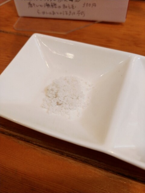 別皿に、麺味見用の塩(山塩小僧?)、増した『やまつ辻田さんの実生柚子と国産たかのつめで作られた柚子胡椒と朝倉粉山椒をご用意致しました』