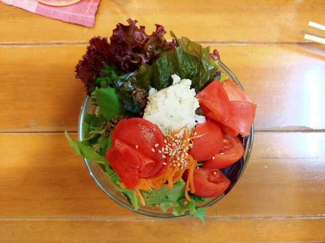 つけ汁内にトマト、山盛り葉材を始めとする生命の野菜たち、白ごま