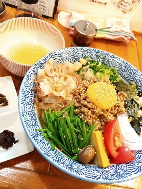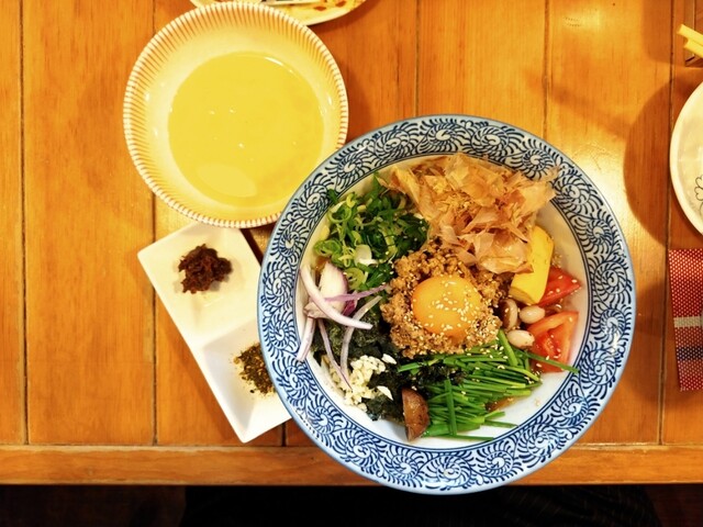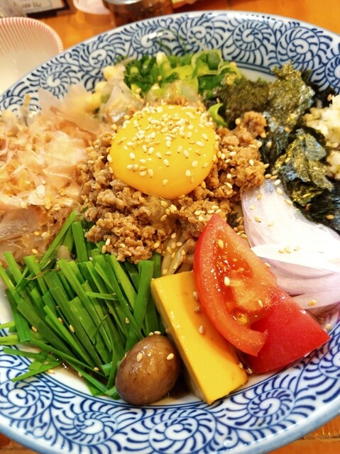 具材は、中央に卵黄、そぼろ、アカモク、プチトマト、刻み海苔、虎豆、ネギ、ブラウンマッシュ、鰹節、肉片