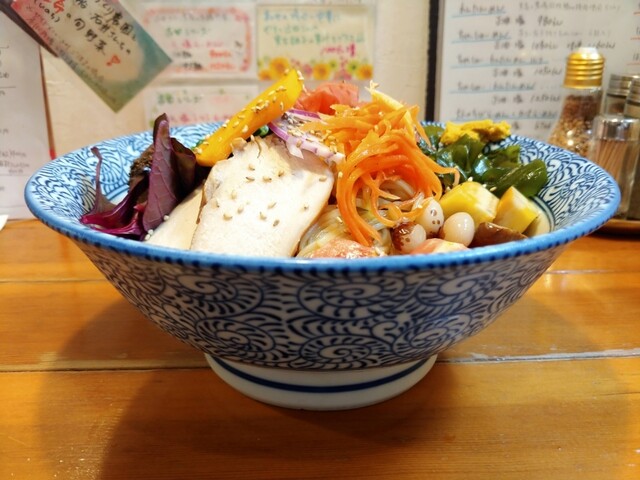旨味たっぷりのタレは森やスペシャルなまろやか酸味が力を発揮し麺と生命の野菜を繋ぐ