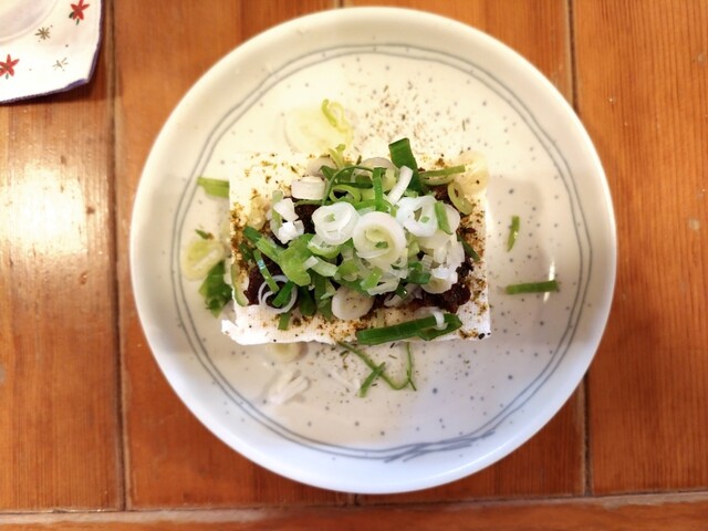 もろみ豆腐は、濃いめに味の付いたもろみで豆腐食わすやつ