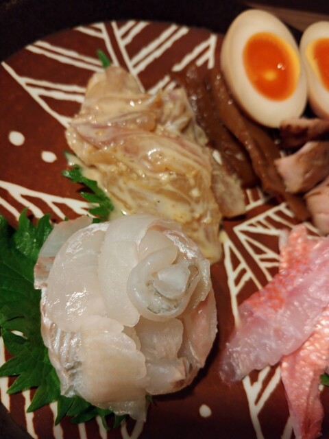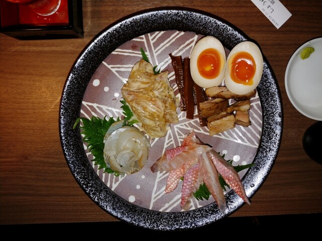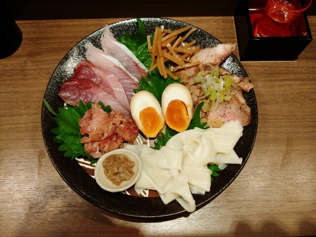 この日は、千葉産ハマチ、愛媛産ブリ、静岡産キハダマグロたたき(なめろう)、酒盗、小麦の刺身、チャーシュー、細切りメンマ、味玉