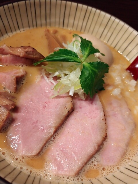クリーミーでチーズに似たコクを持つ濃密鶏白湯に、香り高い節が合わされたと思しき激ウマスープ