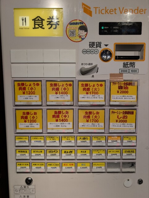 券売機ボタンとしては、2-3種入る"肉盛(中)”や3-5種+吊るし焼きの"肉盛(大)”もあるが、