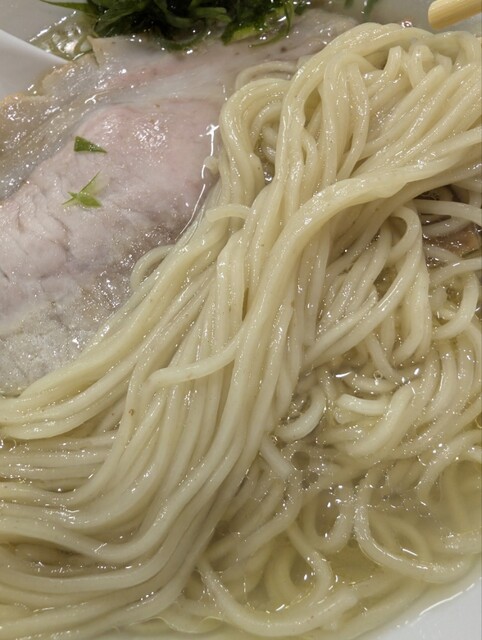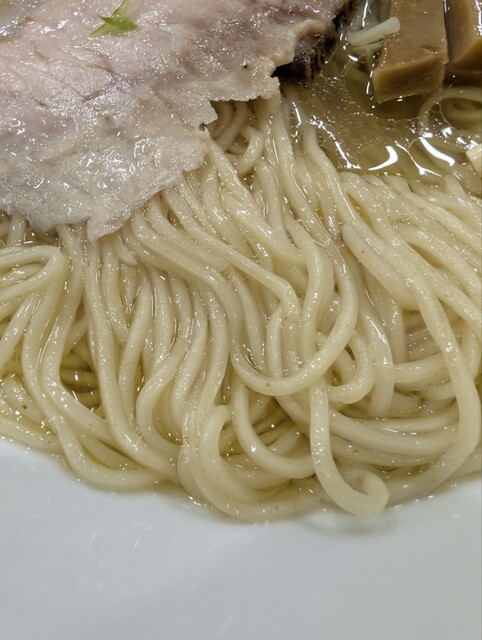 三重県産小麦「あやひかり」と北海道「春よ恋」 をブレンドした自家製麺は約1mm強□断面の淡い全粒粉が練りこまれたストレート極細