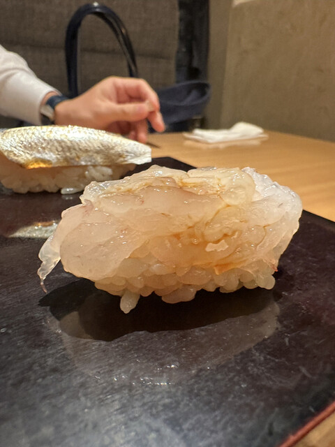 氷見の寒鰤からおつまみ⇨つまみとバランスよく、テーブル席にも1〜2貫づつで提供するお店の姿勢にも感心。