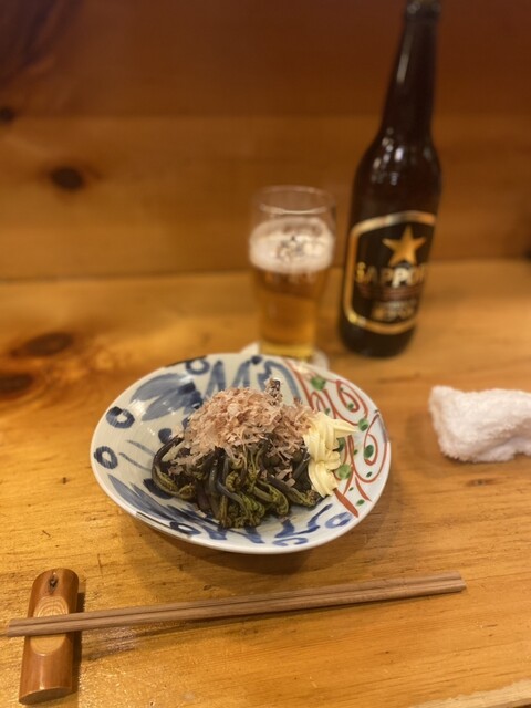 「ビール貰いますね!」と声をかけ、入り口横のリーチインからエビスの大瓶を取り出し、自分で栓を抜き、席に着いた。
