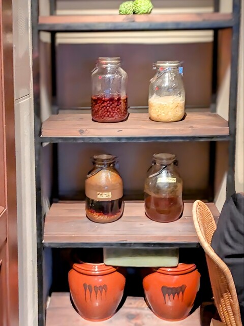 棚には壺や瓶が置かれた発酵食材