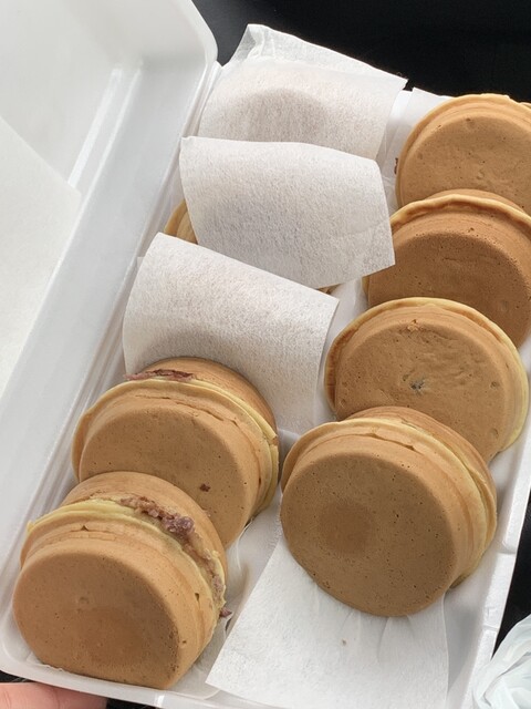 息子と2人車で焼きたてのクリーム、そして持ち帰りは餡子です。