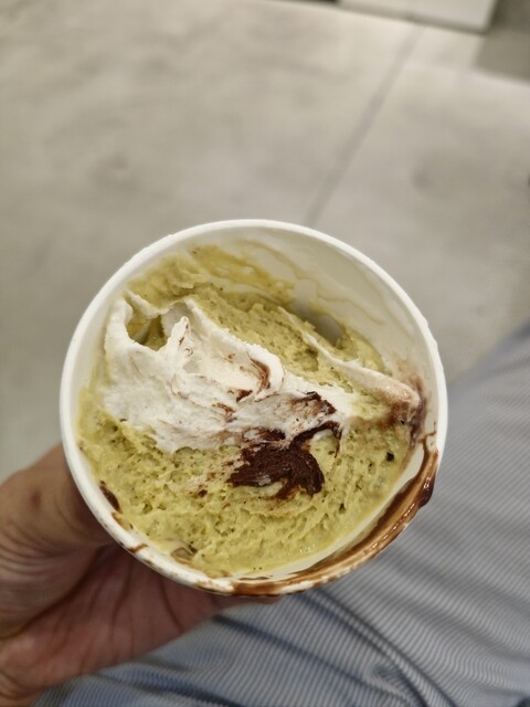 選んだフレーバーはマカデミアナッツ、グランピスタチオ、ストロングダークチョコの3点。あまりにも美味しすぎて、シングル(チーズケーキ)をおかわりしました。どれも甘さは控えめ。濃厚な牛乳の風味を感じながらそれぞれのフレーバーの味をしっかり味わえるジェラートです。