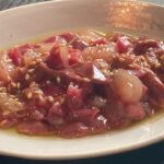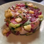 桜エビのタルタル。柘榴や洋梨が入っていて、「和」なんだけども「洋」、「洋」なんだけど「和」みたいな、絶妙なバランスの美味しさです。永遠に食べ続けることができそう。