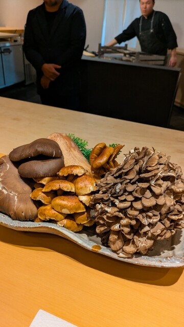クエ、めのこ餡、月光百合根のフリットにはなとみそ。