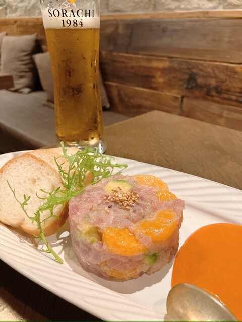マグロとアボカド みかんのタルタルは、みかんの酸味が絶妙に効いてて新感覚な味♪