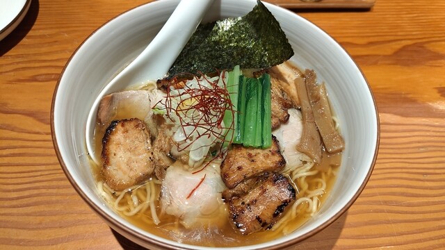 普通の塩ラーメンとは色味の違うスープですが、濃厚な鰹出汁のせいとのこと、一口飲むだけで至福の味わい。炙り豚の香ばしい香りとなめらかな麺、すべてが整っていて言う事無しです!