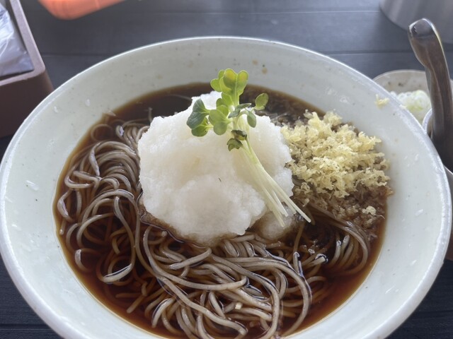 この日は暑かったので、冷やしおろし蕎麦を頼んで、暫く待って料理が届いた。蕎麦は普段もりしか食べないのだが、これはこれで大根おろしがたんと盛られて、添えられた天かすがいいアクセントになって美味しかった。つゆの濃さもちょうどいい。素晴らしい眺望を見ながら頂く蕎麦は本当に美味しい。