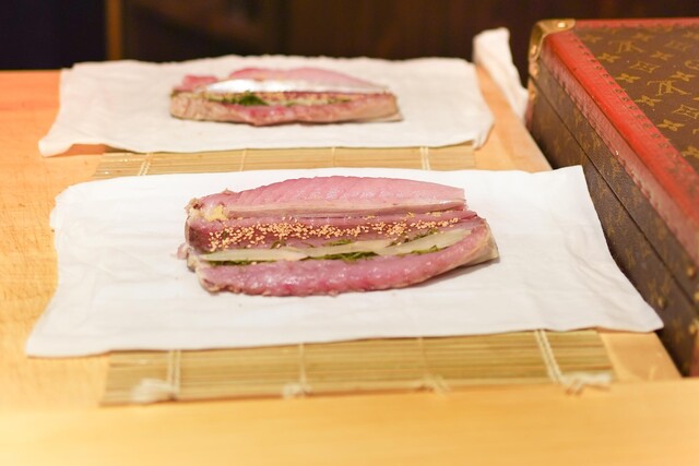 日本一高いアジに、まぐろ、かわはぎとすばらしい味、それにくわえ、いぶりがっことマスカルポーネ、からすみ餅とちょっとしたものまで美味しい。