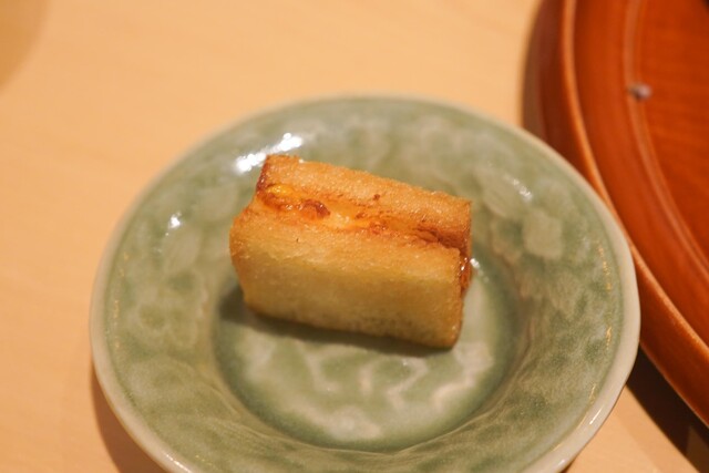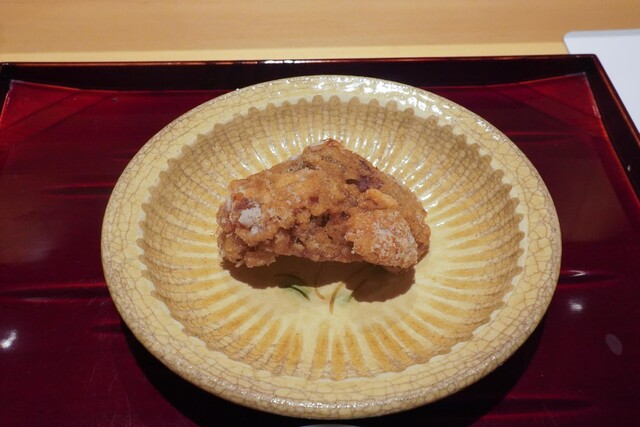鮎は玉子たっぷりで大振り、東京の日本料理店は普通骨まで火が通らないのでこのサイズは使わない。どう工夫されているか判らないが骨まで柔らかくなっている。しかも子持ちは少し身がぱさつくのだが、素揚げすることでそれを補っている。確かな技術が旨さを生む。