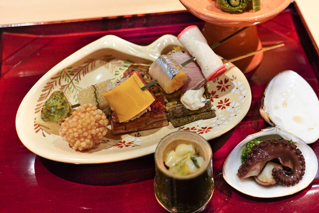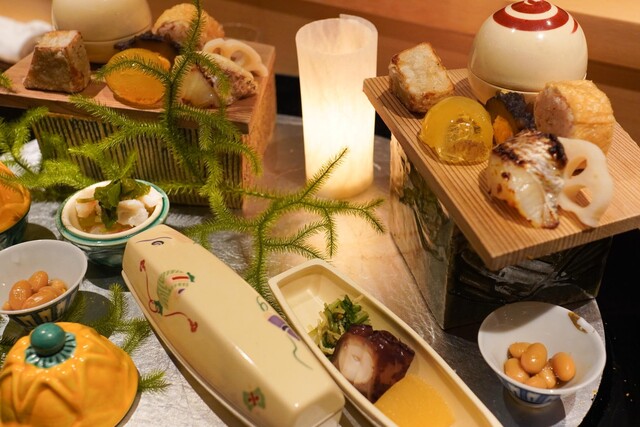 うなぎ昆布巻き、鰆の幽庵焼き、銀杏、蛸、うずら西京焼き