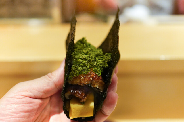 鰻、玉子真丈、花山椒の手巻き