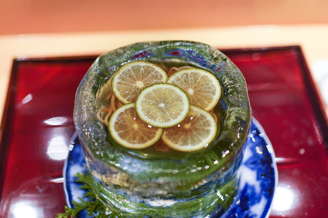 アジサイの八寸は感動的、もう30回来ているがこのバージョンは初お目見え、氷をくり抜いた器に蕎麦、それに水ようかん、招福楼スタイルだが、これも新しい試み、夏バージョンのしのはらもすばらしい