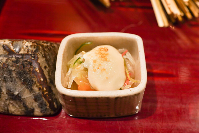 ◆八寸:にしん昆布巻き、柿なます、赤蒟蒻とトマト、椎茸白和え、あげ銀杏