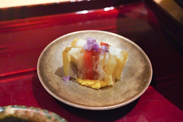 大徳寺麩、赤万願寺唐辛子、キャビアと菊花ぽん酢ジュレ、甲羅返しの器