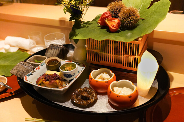 八寸:にしん昆布巻き、柿なます、赤蒟蒻とトマト、椎茸白和え、あげ銀杏 ほうれん草としめじのお浸し、チーズを挟んだお麩、鮑の煮っ転がし 菊と蛸の酢の物、無花果の胡麻ダレ、鰆の塩たたき、ホタテの昆布締め