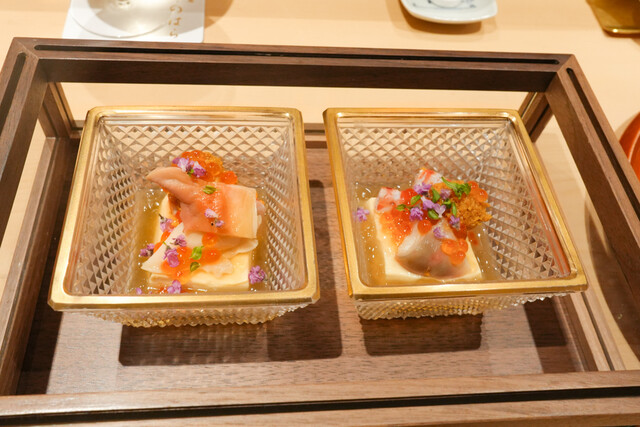 瓜のすり流しとはだてのうに、胡麻豆腐