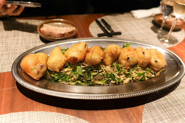 最初のブリニ、キャビアが贅沢に乗っているが、それより生地の美味しさに感動する。フリットの揚げ方も独特というか、無茶苦茶美味しい。