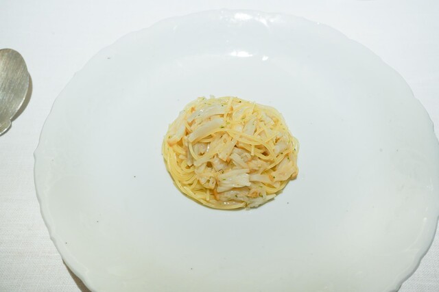 フグの白子もサトシさんが作るとやはり透明感がある、すっきりした味わいと焼いた香ばしさも別々のすっきりした味わいとして飛び込んでくる。最近、ビーフンよりカッペリーニがおおくなっているが、これをさすがである。 チョリソーは定番料理だが、普通のチョリソーとは別物、これがまたすごく美味しい。