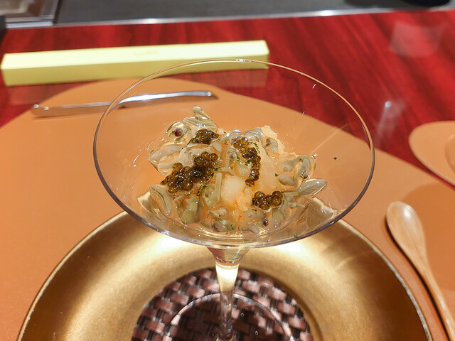 ボタン海老キャビアのタルタル、ジュンサイいくらジュレかけ