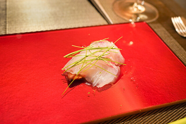 金目鯛を昆布締めしたもののあぶりのカルパッチョ、ワサビ、トラフグの白子のソースにからすみ