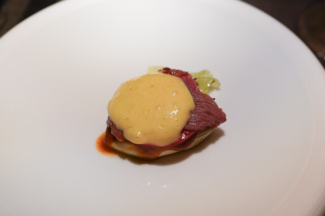一番美味しかったのはザブトンとうに鮟肝の一品、半生のサブトンがいい具合で、うにと鮟肝が上手くまざりあい、春菊のソースがまたいい。すばらしかった。