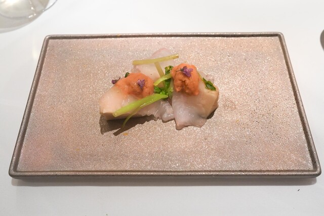 2品目は、ゴールドトビッコのつぶつぶ感がたまらない。いい素材とソースの組み合わせでとてもおいしい。フカヒレのオニオングラタンスープも最高だった。こんな組み合わせ見たことないが、小野マジックが活かされている。